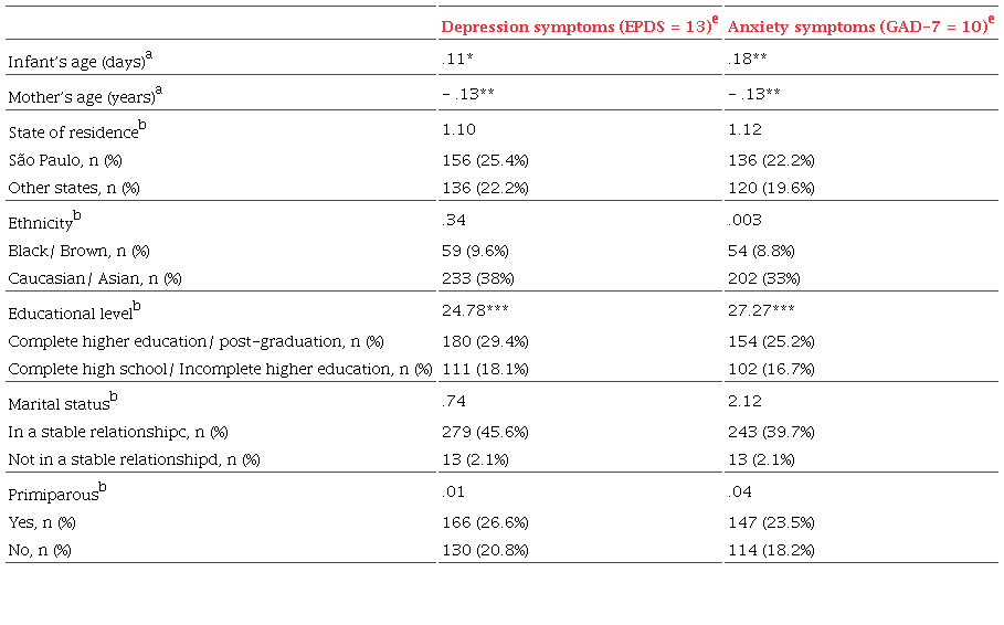 Resumo: Estudos internacionais têm reportado níveis elevados de sintomas de depressão e ansiedade em mulheres no período perinatal, em resultado da atual pandemia. O presente estudo avaliou a sintomatologia de depressão e ansiedade em puérperas durante a pandemia de Covid-19 no Brasil. Participaram 625 mulheres, com idades entre 18 e 44 anos (M = 31.6; DP = 5.3), que tinham um bebê de até 6 meses de idade. Foram administrados o Questionário de Transtorno de Ansiedade Generalizada (GAD-7) e a Escala de Depressão Pós-Natal de Edimburgo (EPDS). Os resultados mostraram níveis clinicamente significativos de depressão (EPDS ≥ 13) em 47.4% das participantes, níveis clinicamente significativos de ansiedade generalizada (GAD-7 ≥ 10) em 41.8% dos casos e sintomas comórbidos em 33.1% da amostra. Registrou-se uma correlação positiva significativa entre os sintomas de depressão e ansiedade. Além disso, mais dias de vida do bebê, idade mais jovem da mãe e menor nível de escolaridade estavam associados a níveis potencialmente clínicos de sintomas. Assim, é prioritária a definição de programas de prevenção e intervenção na saúde mental perinatal durante o atual período pandêmico, com continuidade para o futuro.
