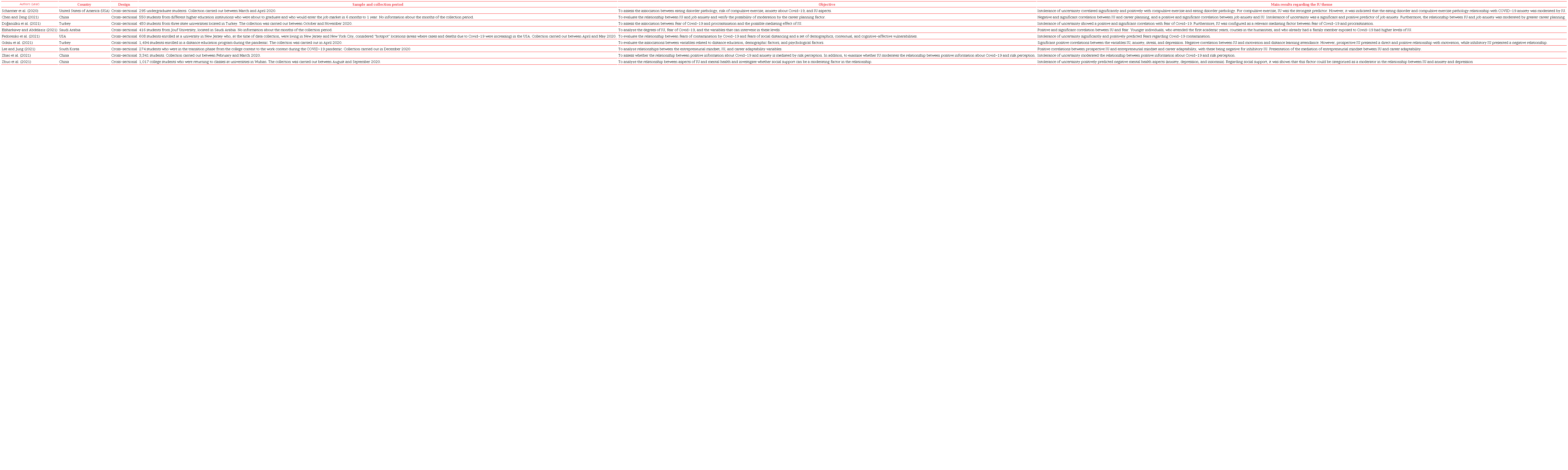 Regarding the contexts in which the students found themselves, some studies highlighted specific situations that the participants were experiencing during the data collection. Chen and Zeng (2021) and Lee and Jung (2021) specified that the students were about to graduate; therefore, they were in the transition phase from the higher education context to the labor market context; Zhuo et al. (2021) indicated that the students were returning to classes at universities in Wuhan, China; Fedorenko et al. (2021) reported that students were living in New Jersey and New York City, places considered hotspots and Göksu et al. (2021) showed that students were enrolled in a distance education program due to the pandemic.