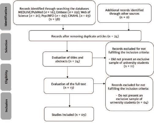 Figure 1 shows the flowchart of the steps and results of the screening process. In total, 58 publications were found in the databases. After excluding duplicate studies, 24 were obtained, all with their titles and abstracts analyzed. After eliminating 11 of these studies for not fulfilling the eligibility criteria, 13 were subjected to verification of the full text. After the screening, nine studies were included.