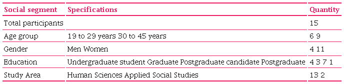 Table 1 presents the participating subjects and their general characterization, divided into three elements: social segment, specifications, and quantity.