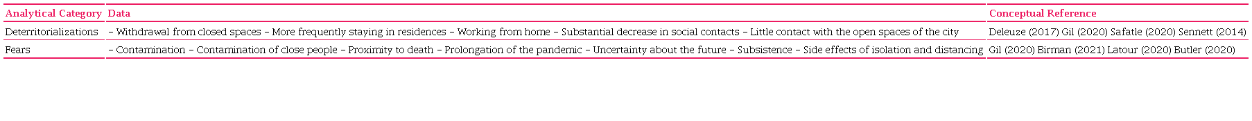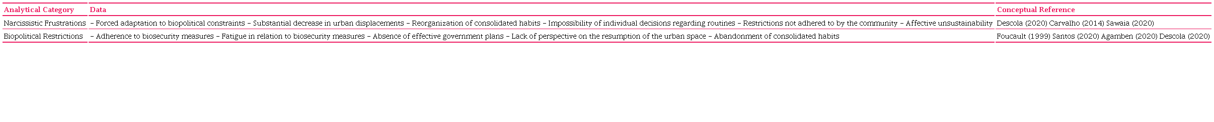 Faced with this global event with a collective impact on the subject’s relationship with the urban space, sharing the first perceptions and practices related to affective experiences was simultaneously marked by pain, fear, and surprise. Guided by the hypothesis raised in this study, which seeks to understand the effects of gross deterritorializations engendered by the sanitary biosecurity measures primarily aimed at the urban space, the qualitative results of the study presented here were systematized in three tables. These were composed by the general characterization of the participants, whose names were modified to guarantee the anonymity of their data, as well as by the summary presentation of the results obtained and organized in the two axes already specified above.