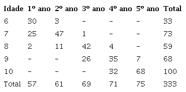Participaram deste estudo 333 crianças mineiras (53,8% meninas), com idades entre 6 e 10 anos (M = 8,39; DP = 1,37), todas estudantes de escola pública, matriculadas entre o primeiro e o quinto ano do ensino fundamental I. A Tabela 2.1.1 indica a distribuição dos participantes considerando a idade e o ano escolar.
