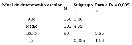 Na sequência, buscou-se verificar se a versão de rastreio seria capaz de diferenciar crianças com alto, médio e baixo desempenho escolar. Os resultados da análise de variância (Anova) indicaram diferenças estatisticamente significativas na reprodução das figuras da versão de rastreio do B-SPG entre os grupos [F (131, 1308) = 65,53; p < 0,001]. No entanto, conforme exposto na Tabela 3.1, a prova post hoc por método de Tukey indicou que apenas dois grupos se diferenciaram entre si.