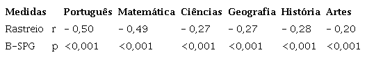 De modo geral, verificou-se que as correlações de magnitude forte foram entre o desempenho na versão de rastreio do B-SPG e as disciplinas de português e matemática. Ao retomarem o conceito de que a maturidade perceptomotora é a junção da capacidade de integrar a percepção visual com movimentos motores, Suehiro e Santos (2005), Carvalho et al. (2012) e Suehiro et al. (2015) já apontavam para a estreita relação dessa habilidade com a leitura e a escrita. As autoras verificaram que crianças com baixo desempenho no B-SPG tendem a ter dificuldades na compreensão da leitura e execução da escrita. Com relação à matemática, a integração da percepção visual também é essencial na resolução de tarefas matemáticas, pois é um processo que requer uma compreensão analítica e sintética das informações recebidas (Alves & Brito, 2007).