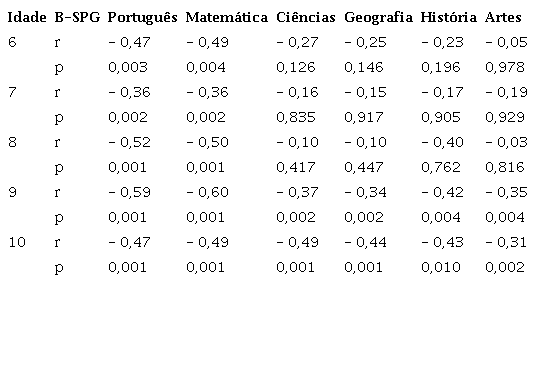 A partir da Tabela 3.3, pode-se verificar que, para o grupo de crianças com 6, 7 e 8 anos, as correlações foram estatisticamente significativas e negativas apenas para as disciplinas de português e matemática. Em relação ao grupo de estudantes com 9 e 10 anos, todas as disciplinas indicaram correlações significativas. De modo geral, a magnitude das correlações foi de moderada a forte (Cohen, 1988), e os coeficientes variaram de r = - 0,34 a r = - 0,59.