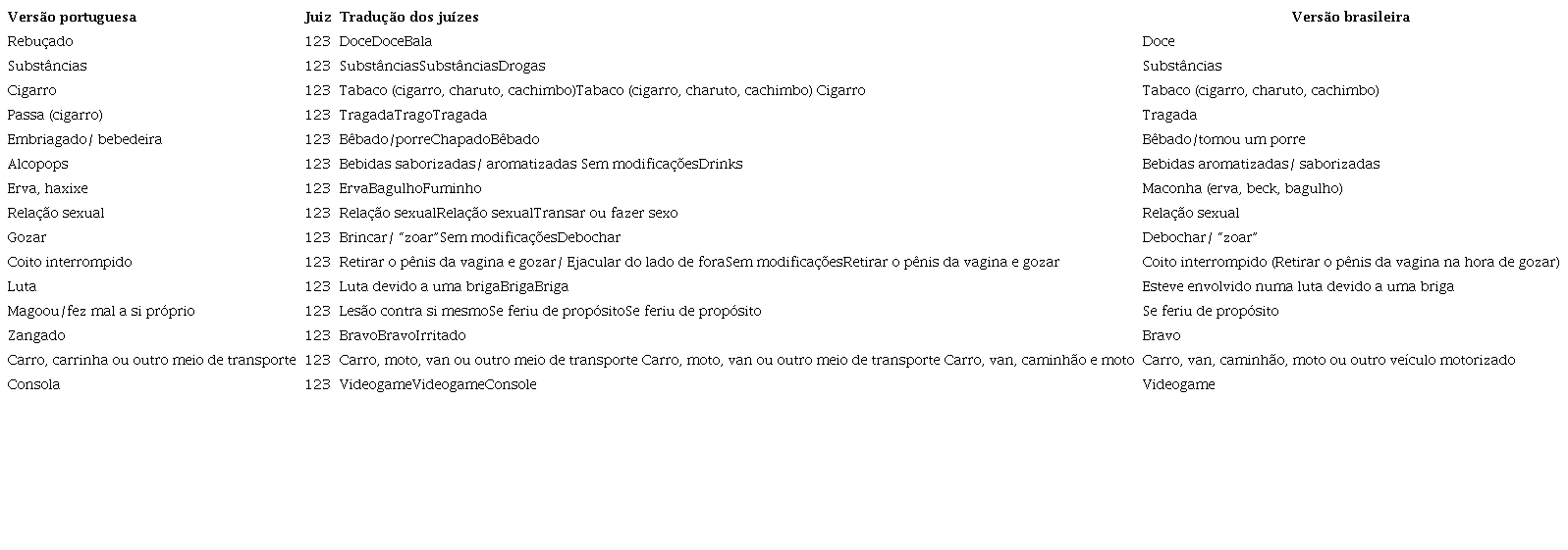 A Tabela 3.1.1 apresenta as principais divergências de tradução e adaptação de conceitos do questionário para a realidade brasileira entre os juízes. A partir da versão de cada juiz, 15 palavras foram adaptadas para o português e para a realidade brasileira, ficando a síntese a critério do comitê de avaliação. Alguns termos foram adaptados a partir do levantamento de expressões comumente utilizadas na realidade adolescente brasileira, como os sinônimos para maconha, embriaguez e chacotas/xingamentos entre pares, a partir da expertise dos juízes na área. Ao final, concluiu-se pela versão brasileira, integrada ao instrumento e avaliada satisfatoriamente pelos participantes.