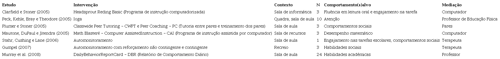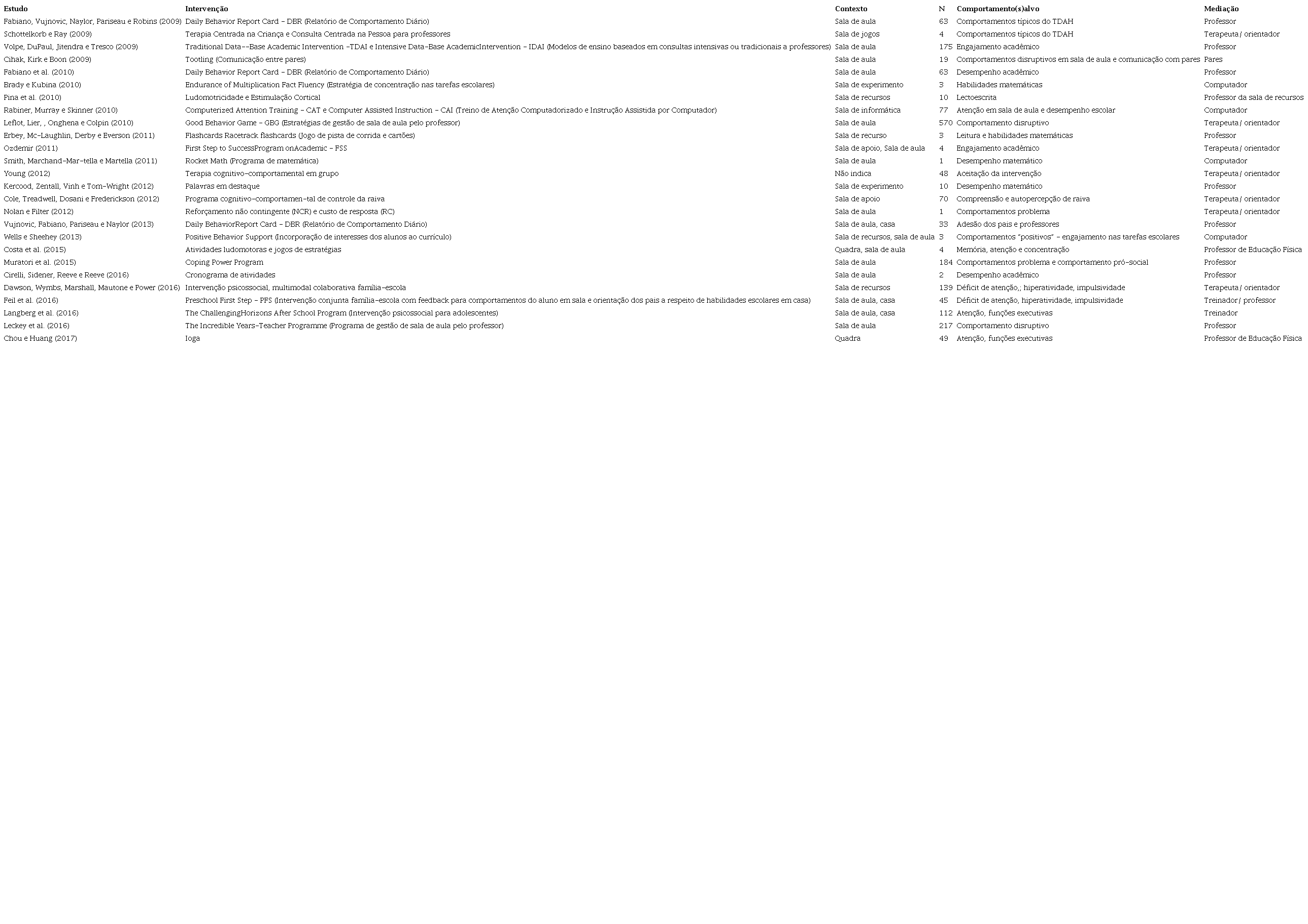 Os nove estudos restantes tratam de cinco diferentes intervenções mediadas por professores: Relatório Diário de Comportamento (DBR) ou Cartão de Registro Diário (DRC), Intervenção Acadêmica Tradicional Baseada em Dados (TDAI), Intervenção Acadêmica Intensiva Baseada em Dados (IDAI), Cronograma de Atividades, Programa de Treino de Manejo de Sala e Flashcards Racetrack.