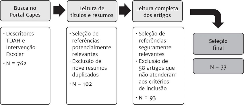 Para a busca inicial, foram utilizados nove diferentes descritores, quatro deles referentes a denominações do transtorno (hyperactiveness, hiperactivity, attention deficit e ADHD) e os demais a intervenções (psychopedagogy, psychopedagogical, school intervention, classroom intervention e classroom strategies). Os descritores foram combinados dois a dois (uma denominação e uma de intervenção) formando 20 pares de palavras. A partir da análise das palavras-chave dos artigos que retornaram, restringiu-se a busca aos descritores ADHD e school intervention. Fez-se essa escolha porque o descritor school intervention foi o que se mostrou mais efetivo no retorno de artigos relacionados ao objetivo. A busca inicial com os descritores psychopedagogy e psychopedagogical retornava muitos artigos de intervenções clínicas realizadas fora da escola. Os descritores classroom restringiam a busca, deixando de fora intervenções realizadas na escola, mas fora da sala de aula.
