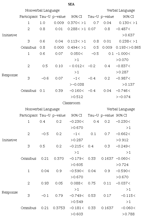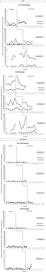 In conclusion, the general effect of the intervention measured by the omnibus effect size in SEA showed an increase in verbal initiatives and a reduction for verbal responses, both with statistical significance during the intervention. Considering nonverbal language in the SEA, the omnibus effect size indicated a very large and statistically significant for the nonverbal initiatives of the participants, while for nonverbal responses there was a small without statistical significance.