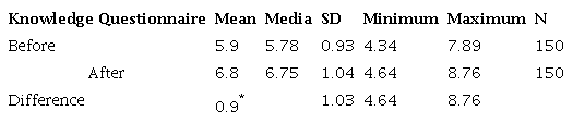 Regarding the SKQ questionnaire, the mean score improved significantly from 5.9 (SD 0.93) before 6.80 (SD 1.04) after training (p <0.01) (Table 3.1).