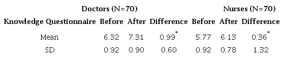 When we split the professionals into the categories doctors and nurses, knowledge improved in both categories (p < 0.01), and there was no interaction between them (p = 0.16) (Table 3.2).