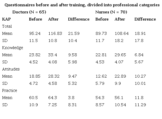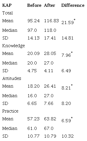 Table 3.3 describes results of the KAP questionnaire (Knowledge, Attitude, and Practice). Considering the total score of the KAP, there was an improvement of 21.59 points, from 95.24 (SD = 14.13) before training to 116.83 (SD = 17.41) after training (p <0.01). The same pattern was observed for the mean Attitude and Practice levels.
