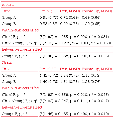 With regard to the results of the between-subjects analysis, no significant differences were found for the group factor in anxiety (F(1, 46) = 1.688, p = 0.200, η² = 0.035) or stress (F(1, 46) = 0.485, p = 0.490, η² = 0.010), indicating that there was no significant group effect on these variables.