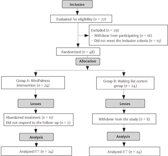 The mindfulness instructor responsible for creating the intervention was blind to the performance obtained by the participants throughout the study and did not have direct contact with them, since the interaction with the participants took place only through previously produced audios and videos. There was no active control and, therefore, the participants in the waiting list group knew that they were not receiving the intervention.