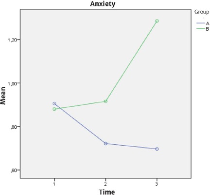 About the analysis of comparisons between the time versus group factors, the analysis using the Pairwise method only found statistically significant differences at time 3 (p = 0.002) between the groups for the anxiety variable, indicating that the participants in the intervention group had significantly lower anxiety scores than the control group participants at follow-up, as depicted in Figure 2.