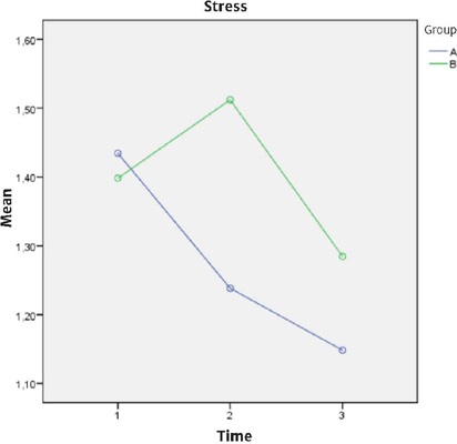 From the verification of the statistically significant differences described above, relating the time factor and the measures of anxiety and stress, as well as the relation with the group factor, the Bonferroni post-hoc test was applied to verify where these differences were found. Analyses using the Pairwise method showed that when comparing the moments of anxiety assessment, the intervention group did not present significant differences (p > 0.05) between any of the times (Pre-intervention (1), post-intervention (2), Follow-up (3)), indicating that, although there was a decrease over time, anxiety levels remained relatively stable. For the control group, the comparisons showed a significant difference (p = 0.001) between the pre-intervention (M = 0.88 SD = 0.68) and follow-up (M = 1.29 SD = 0.65) times, and post-intervention (M = 0.92 SD = 0.73) and follow-up times, indicating that throughout the entire period of the study there was an increase in the anxiety of the participants in this group, as shown in Figure 2.