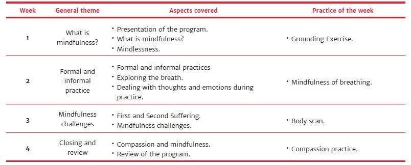 Each week, participants received mp3 audio recordings of the video received during the week. The participants were instructed to watch the video on the day of its publication (Monday) and to practice the recorded exercises over the following 6 days. The weekly audios lasted approximately 10 to 15 minutes (which could vary according to the type of practice proposed for the week) with guided mindfulness exercises (Table 1). The videos and recordings were prepared by an instructor with more than 5 years of experience, trained by the Centro Mente Aberta – Brazilian Center for Mindfulness and Health Promotion. Mente Aberta’s professional certification follows the British and Brazilian guidelines for good mindfulness practices.