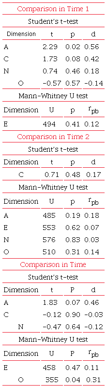 A significant difference was found only in the Agreeableness domain (t(65)=2.29; p=0.02; d=0.56), indicating that Intervention Group A (GA) has an advantage over the Control Group (CG). Regarding the effect size (d =0.56), a moderate effect was found on the differences between groups at Time 1 in this domain. The remaining domains did not show statistically significant p-values. An interesting result is that, even though the Conscientiousness domain (C) was statistically significant, its p-value was low, with an effect size (rpb = 0.27) indicating that the CG median at Time 1 was lower than that obtained by GA.