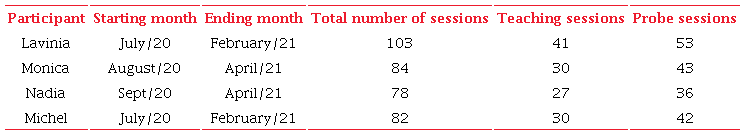 The integrity index was also calculated to assess the implementation of the procedures. It was calculated by dividing the number of correct implementations by the total number of implementations, and the quotient was multiplied by 100 (Sella et al., 2020). Therefore, the results obtained were: 100% for participant Lavínia; 96.5% for Monica; 89.6% for Nadia; and 96.3% for Michel.