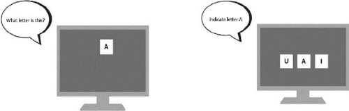 The teaching condition of the experimental stimuli consisted of assessing letter naming and matching dictated and written letters. Figure 1 shows a letter-naming trial (left image) and a letter-identification trial (right image).