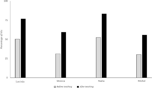 Figure 3 shows the percentages of correct responses in naming letters before and after the teaching session. For the calculation, the total number of correctly named trials before the teaching was divided by the total number of trials evaluated before and after the teaching sessions. Note that the four participants improved their performances after the teaching sessions. Lavinia correctly named 50.3% of the letters before and 76.7% after the teaching sessions. Monica named 31.2% and 59.4% of the letters correctly before and after the teaching sessions, respectively. Nadia named 52.5% of the letters before and 83.3% after the teaching sessions. Michel named 30.3% and 55.7% of the letters correctly before and after the teaching sessions, respectively.