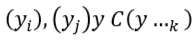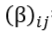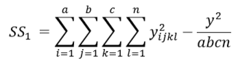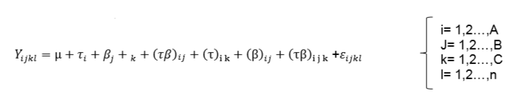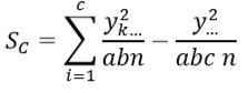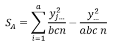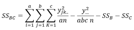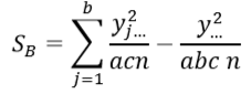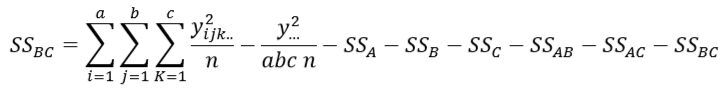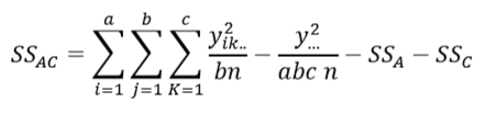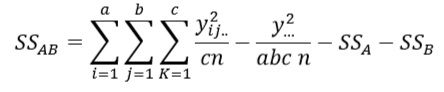 [11]La suma de cuadrados de los subtotales de dos factores se determinó usando los totales de cada una de las tablas de dos sentidos. La suma de cuadrados de la interacción de los tres factores se determinó usando los totales de las celdas (AxB), (AxC)y (BxC)en tres sentidos (yijk) como especifica la siguiente ecuación: