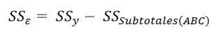 [13]La suma de cuadrados del error se calcula restando la suma de cuadrados de cada efecto principal e interacción a la suma total de cuadrados o mediciones