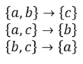 Este proceso continua ahora con los conjuntos de tres ítems que se obtienen combinando los conjuntos de 1 item con los conjuntos de 2 items, un ejemplo seria combina el ítem {a} del conjunto de 1 item con un conjunto de 2 items, por ejemplo {b,c} para formar el conjunto {a,b,c}, este conjunto se buscado en la base de datos de transacciones, y si su soporte es mayor al soporte mínimo entonces forma parte del conjunto de tres ítems.