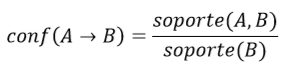 La medida de confianza de una regla de decisión () es la división entre el soporte de la regla de decisión entre el soporte del antecedente de la regla de decisión, esto está representado por la siguiente ecuación: