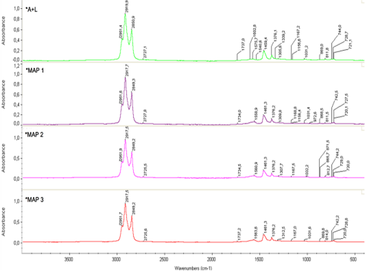 A continuación la figura 1 muestra los resultados obtenidos mediante el ensayo de espectroscopia infrarroja, obteniendo los espectros de transmitancia para cada una de las muestras evaluadas, siendo estas: un muestra de referencia: A+L y tres variantes de MAP: MAP1, MAP2, MAP3.