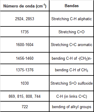 Los ensayos de espectroscopía infrarroja de transformada de Fourier mediante la técnica de muestreo de reflexión total atenuada (FTIR-ATR) se realizan en un espectrómetro Nicolet 6700 usando un divisor de haz de KBr y un detector DTGS KBr en el rango de 400 cm-1 a 4000 cm-1.