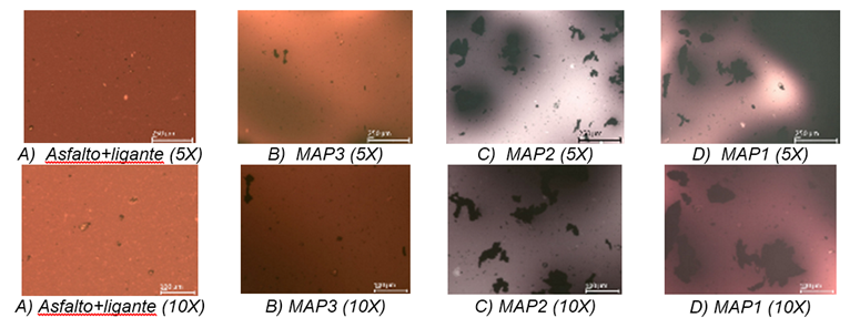 En la Figura 2 se muestran las imágenes obtenidas mediante el microscopio estereoscópico de las muestras de asfalto+ligante, MAP3, MAP2 y MAP1 a diferentes aumentos. A partir del análisis de la figura se evidencia claramente la presencia de una sola fase, continua (Figura 2A), asociada al asfalto más el ligante. Esta fase es bastante homogénea, aunque se observan pequeñas partículas (exceptuando las de color blanco y las de mayor tamaño que son zonas sin recubrimiento producto de la preparación de la muestra) que al parecer están presentes en la muestra.