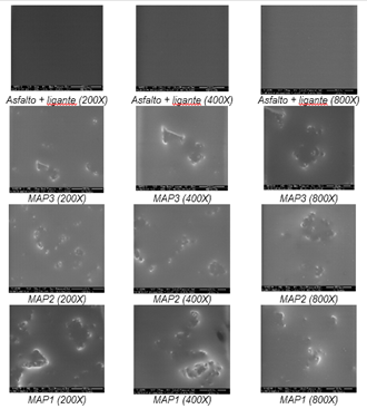 Se estudia también la morfología y microestructura de estas muestras demostrando que la muestra de referencia (A+L) evidencia claramente la presencia de una sola fase, continua, asociada al asfalto más el ligante, mientras que las muestras de MAP están en presencia de dos fases, una continua (el asfalto) y una dispersa (el polímero), se comprueba que el polímero presenta un tamaño y una morfología variable y se observa además zonas donde presumiblemente el polímero se ha aglomerado con una distribución no homogénea del mismo.