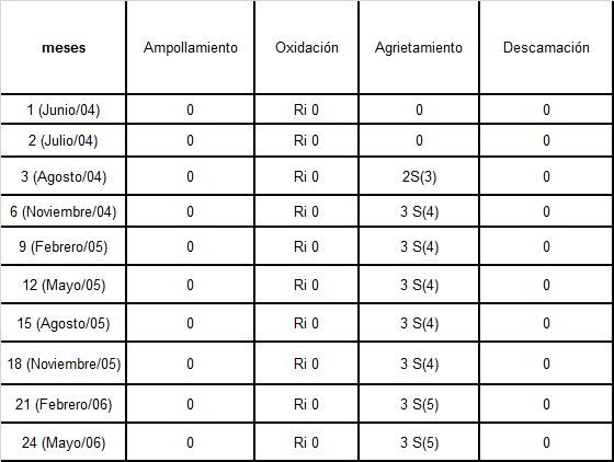 Los resultados de la evaluación de la degradación de los materiales compuestos de MAP se muestran en las Tablas 3 y 4, específicamente refiriéndose a las fallas que pueden surgir como por ejemplo: ampollamiento, oxidación, agrietamiento y descamación. La importancia de esta evaluación radica en los resultados que ofrece estos ensayos; pues se obtiene el comportamiento de estos recubrimientos ante el medio que se exponen, y específicamente el lugar de la prueba en la Estación de Ensayo de Varadero presenta una agresividad corrosiva del acero de bajo contenido de carbono clasificada de Muy Alta.