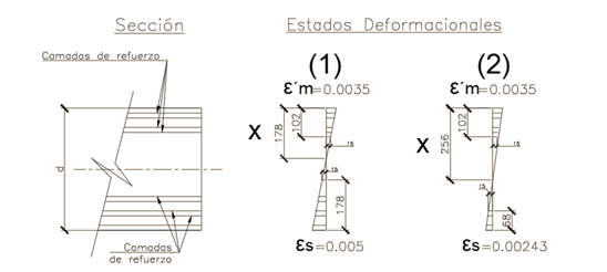 A partir de la figura anterior se puede conocer que la mínima cantidad de camadas que se pueden aceptar de tal forma que todas las camadas esten fluyendo son 4, determinadas por la zona en compresión. Para la realización del diseño se tomarán dos y en caso que no sea posible distribuir el refuerzo en esas dos camadas se conoce que se puede contar con 4 camadas siempre y cuando se obtenga un valor de profundidad de linea neutra (x) mayor que 178 cm (Estado deformacional 1) y menor que el valor de profundidad de linea neutra (x) para el que la cuarta camada en tracción deja de fluir (256 cm, Estado deformacional 2).