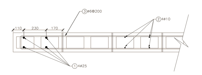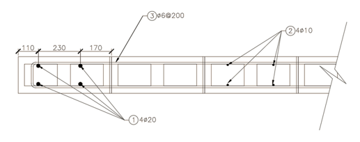 En el diseño del refuerzo longitudinal se obtiene como resultado a partir del sistema de ecuaciones formado por las ecuaciones 6 y 7 que x=251,3 cm y 〖A´〗_s=A_s=16,2 〖cm〗^2. Las comprobaciones correspondientes permitieron corroborar que los aceros fluyen y se mantiene el equilibrio en la sección. Según la NC 774:2012: