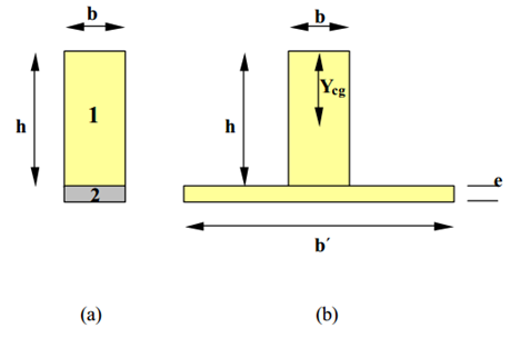 Las vigas reforzadas fueron analizadas por el autor de acuerdo con la teoría clásica de la flexión, que considera los estiramientos y acortamiento de las fibras longitudinales proporcionales a sus distancias al eje neutro, considerando el material en el régimen elástico lineal. Para este tipo de viga, constituida por dos materiales diferentes basta determinar la sección equivalente de la viga idealizada constituida por apenas uno de los materiales. La sección rectangular mostrada en la Figura 1 (a), constituida por madera (material 1) y fibra (material 2) ilustra este modelo. Para el refuerzo de fibra se establecerá un ancho igual al de la viga de madera y espesor "e".