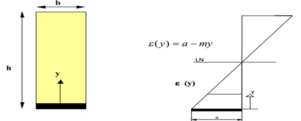 Para la evaluación del momento flector último será considerado los estados límites de ruptura por tracción y por compresión de la madera. Este modelo se obtiene a partir de la hipótesis de Navier / Bernoulli (las secciones planas permanecen planas después de la deformación), como ilustra la Figura 2. Siendo “m” el ángulo de giro de la sección al deformarse.