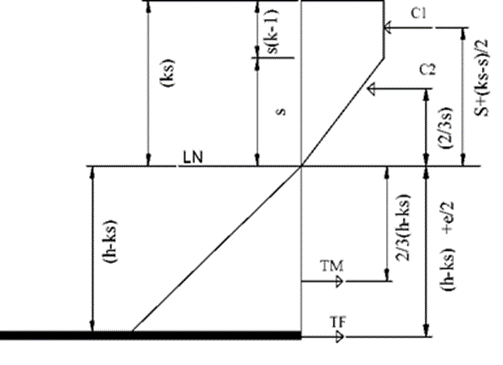 Se considera alcanzado el estado límite de tracción en la madera, cuando la máxima tensión actuante de tracción en la madera es igual a su resistencia a la tracción. A partir de las relaciones establecidas entre las tensiones y las deformaciones, la Figura 5 presenta la distribución de tensiones cuando este estado límite es alcanzado, así como las fuerzas resultantes de esas tensiones y sus posiciones [3].