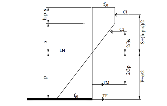 Se considera alcanzado el estado límite último en la compresión cuando la máxima deformación en la parte comprimida alcanza el valor ε_2. A partir de las relaciones establecidas entre tensiones y deformaciones, la Figura 4 presenta la distribución de tensiones cuando este límite es alcanzado, así como las fuerzas resultantes de estas tensiones y sus posiciones ⦋3⦌.