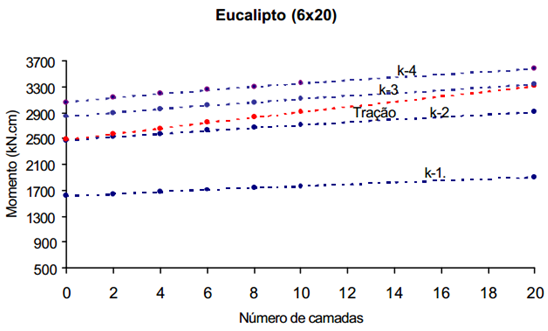 Con el objetivo de evaluar la influencia del número de capas de refuerzo en la resistencia de vigas de madera, se presentan gráficos elaborados a partir del modelo teórico deducido para tracción y para compresión. Para este último fue variada la magnitud de plastificación de 1 a 4 (parámetro k).