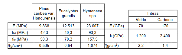 Las especies adoptadas en el análisis son Pinus hondurensis (Pinus caribea var. Hondurensis), Eucalipto grandis (Eucalyptus grandis) y Jatobá (Hymenaea spp) ⦋1⦌. Los valores de los módulos de elasticidad de las fibras y de la madera utilizados en los cálculos de Fiorelli se presentan en la Tabla 1. Los cálculos del momento se hicieron considerando el grosor de la fibra, no se consideró el aumento en el espesor debido a la aplicación del adhesivo.