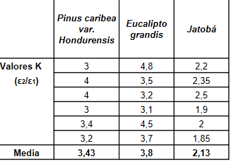 Para el modelo de ruptura por compresión, el cálculo considera la relación entre las deformaciones, ε_2 / ε_1= k. Este valor fue evaluado experimentalmente por medio de ensayos de compresión paralela a las fibras de la madera. Se evaluaron las especies Pinus caribea var. Hondurensis, Eucalipto grandis y Jatobá, ensayando 6 cuerpos de prueba para cada una de ellas. La Tabla 13 muestra los valores del parámetro “k” obtenidos experimentalmente.
