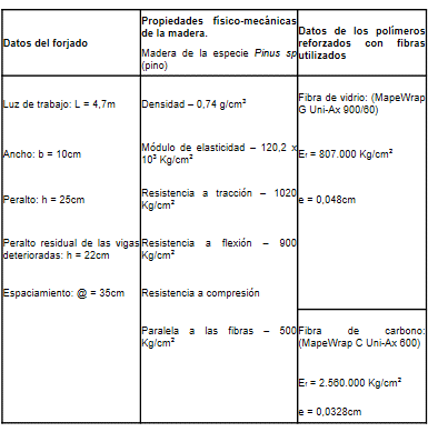 Para determinar el comportamiento de una viga de madera reforzada a flexión utilizando el modelo teórico-experimental de cálculo, tanto para polímeros reforzados con fibras de vidrio como para fibras de carbono, se tomó un inmueble ubicado en el municipio Habana Vieja, de grado de protección 2 establecido por las regulaciones urbanas de esa localidad. Debido al deterioro que se detectó en el local objeto de estudio una vez realizado el diagnóstico por la Oficina del Historiador: desfibramiento de la cara superior de 12 de las 24 vigas que componen el forjado, se tomará el peralto residual para comprobar la capacidad resistente de las vigas y determinar si es necesario su reforzamiento. A continuación, se resumen los datos que serán empleados en el cálculo del refuerzo.
