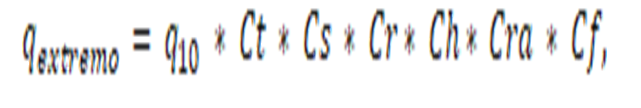 Ecuación (1)donde es la carga de viento extremo en kN/m., es la presión básica del viento y , , , , , , son los coeficientes de recurrencia, de sitio, de ráfaga, de altura, de reducción de la acción del viento y de forma respectivamente.