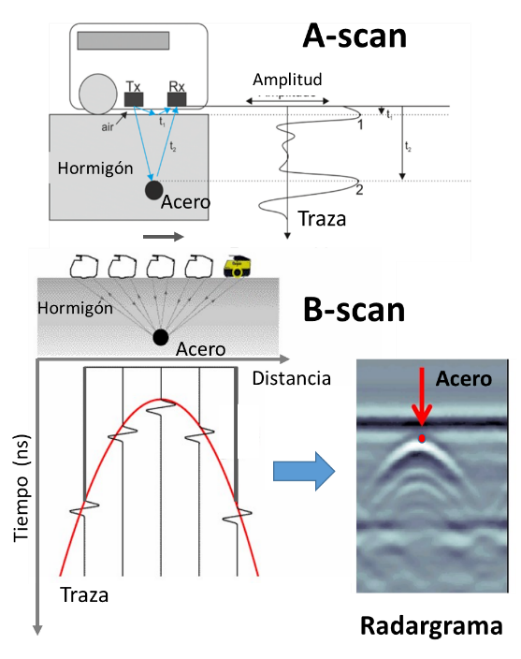 El georradar consiste en la emisión de pulsos de ondas de alta frecuencia al medio y la recepción de la ondas reflejadas y difractadas producidas por las variaciones de las propiedades electromagnéticas del mismo. El equipo consta básicamente de antenas emisora y receptora, que pueden estar en un mismo dispositivo o separadas, y una unidad central que realiza el control de la emisión y recepción de las señales. La antena emisora emite un impulso electromagnético que se transmite por el interior de un medio y es reflejado por toda superficie que presente una impedancia eléctrica diferente. Las reflexiones en distintas interfases son recogidas por la antena receptora, y el conjunto de todas ellas, que constituirá la respuesta del material, queda registrado en una traza (A-scan). El conjunto de trazas registradas a lo largo del tiempo en un material se denomina radargrama (B-scan), Fig 1.