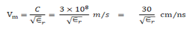 La permitividad o constante dieléctrica es una medida de la capacidad de polarización de un material en presencia de un campo eléctrico. Su rango de variación es entre 1 (aire) y 81 (agua a 20ºC). La respuesta del GPR depende en gran medida de la permitividad dieléctrica, dado que la mayoría de los materiales son no magnéticos ( y dieléctricos (σ=0). Bajo estas condiciones, la velocidad de propagación (Ecuación 1) depende únicamente de la velocidad de la luz en el vacío (c=3 x108 m/s) y de la constante dieléctrica relativa del medio ( ) [7].
