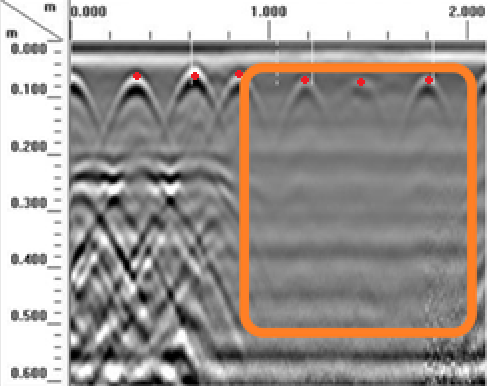 Dinh et al., [16] realizó un estudio en un parqueo subterráneo, para conocer si los aceros embebidos estaban corroídos o no. Se detectó también un sector donde se produce una atenuación de la señal hasta la base de la losa de hormigón (Fig 2). Esta disminución de la amplitud está relacionada con la alta humedad existente en la zona, que hace que la velocidad de propagación de la onda disminuya drásticamente y se pueda delimitar esta área como una zona de corrosión.