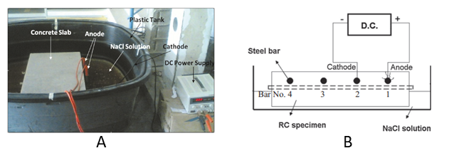 Una práctica común para los ensayos experimentales de corrosión en el hormigón armado, es acelerar el proceso de corrosión sumergiendo una losa de hormigón armado en una solución salina de NaCl al 5% [31-34]. Luego de un tiempo determinado, se extrae la muestra y se aplica corriente eléctrica en el rango de 1 Amperes y 10 Volts, seguidamente se mide con el GPR, ya sea de forma puntual o mediante perfiles. El ensayo simula una pila electroquímica, donde uno de los aceros funciona como cátodo y otro como ánodo, así ocurren los procesos de reducción y oxidación utilizando como medio el hormigón armado (Fig 3). Con esta metodología es posible observar, mediante mediciones continuas, los cambios que se producen en la señal electromagnética en cada una de las fases de corrosión, lo que permite establecer criterios comparativos para evaluar grados de corrosión en diferentes estructuras de hormigón armado.