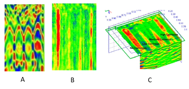 Para determinar el daño producido por la corrosión en una losa de hormigón, Kabir y Zaki [35] se basan en el uso conjunto del GPR y el método de potencial de media celda (HCP, por sus siglas en inglés). En este caso, los aceros fueron colocados en una solución de cloruro de sodio e hicieron incidir sobre ellos una corriente directa durante 1, 3 y 7 días. Luego, los aceros fueron embebidos en una mezcla de hormigón. Después de 28 días de curado, se midió con una antena de 2 GHz de frecuencia de tres modos: A-scan, B-scan y C-scan (Fig 4 A, B y C. Se observó que el primer acero, al cual no se le suministró corriente, se mantenía en perfectas condiciones con una gran intensidad; por otro lado, a medida que aumentaban los días de exposición a la corrosión, mayor era la amplitud, lo cual se evidencia en las barras de color rojo que representan los aceros con mayor corrosión.